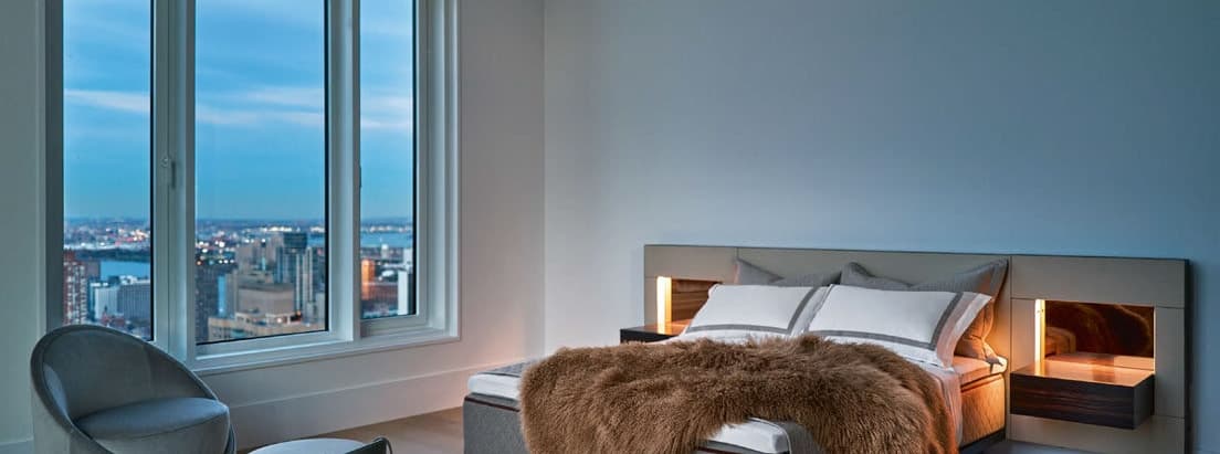Nightstands with concealed drawers are recessed on each side, with integrated lighting offering a soft, ambient glow to surroundings.