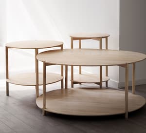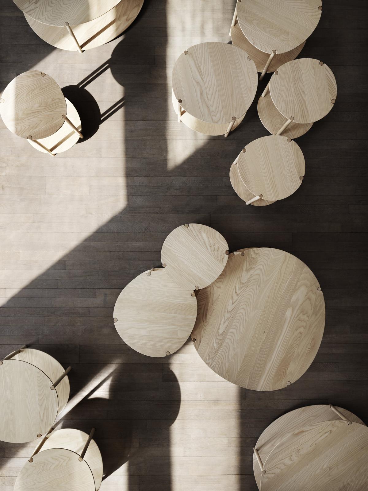 Lunaria’s personality relies on the use of soft and warm wood and its subtle and irregularly rounded table top shapes.