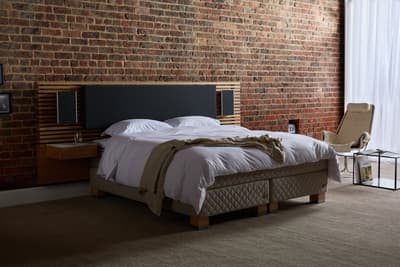 A meticulously crafted solid wood headboard, equipped with innovative Bang & Olufsen technology. Designed and developed as a collaboration between Bang & Olufsen and DUX.