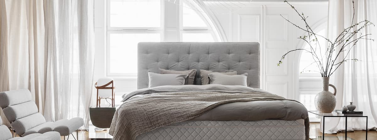 DUX Royal is a series of complementary bed accessories, such as bed skirts and decorative cushions. The design was developed in collaboration with the legendary Hotel d’Angleterre in Copenhagen. A headboard with comfortable, supportive padding. The clean design is based on traditional deep tufting and is also available with or without buttons.
