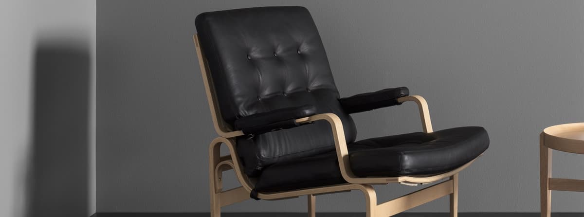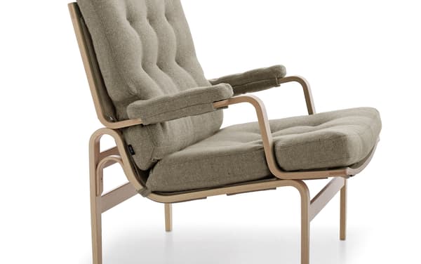 Classic easy chair designed by Bruno Mathsson. Ingrid is a sister to Karin, but in moulded beech wood. Ingrid has buttons on both the seat and the back cushion.