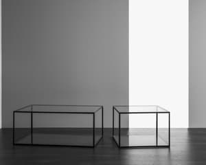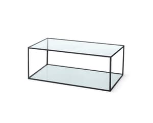 A classic table with a rectangular shape in chrome or black metal, with a glass top and bottom.